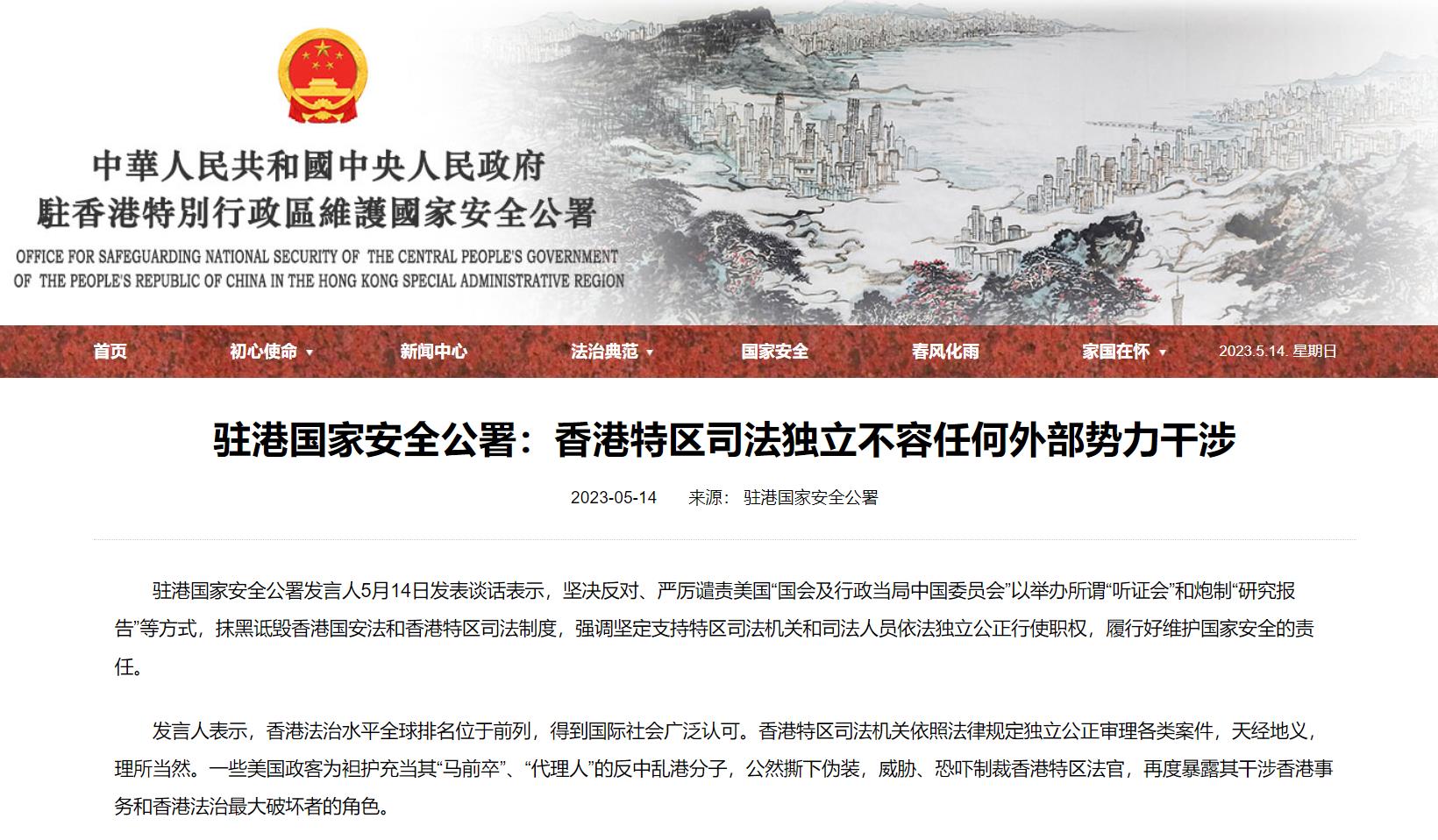 駐港國家安全公署發言人5月14日發表談話表示,堅決反對、嚴厲譴責美國「國會及行政當局中國委員會」以舉辦所謂「聽證會」和炮製「研究報告」等方式,抹黑詆譭香港國安法和香港特區司法制度,強調堅定支持特區司法機關和司法人員依法獨立公正行使職權,履行好維護國家安全的責任。