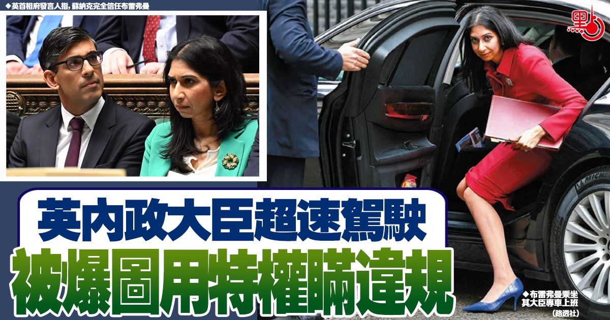 《星期日泰晤士報》等媒體報道,布雷弗曼去年擔任檢察總長期間,在倫敦附近超速駕駛,她可選擇接受罰款和罰分、接受交通安全教育,又或提出覆議。布雷弗曼擔心扣分導致車保費用增加,決定接受交通安全教育。同年9月,布雷弗曼獲時任首相特拉斯任命為內政大臣,主管執法工作。上任後,布雷弗曼跟相關部門人員打招呼,希望能為她安排特殊的「一對一」授課但遭到拒絕,布雷弗曼遂要求她的助手聯繫授課機構,再次提出給她特殊待遇,然而她再次碰壁。