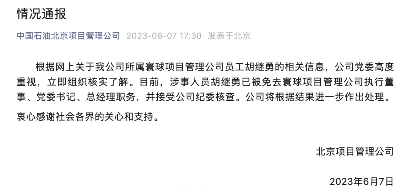 昨日傍晚,視頻中的男子身份被確認,為國企中石油旗下寰球工程項目管理(北京)有限公司執行董事、黨委書記、總經理胡繼勇。之後,中國石油北京項目管理公司官方微信通報,胡繼勇已被免職,正接受公司紀委核查,公司將根據結果進一步作出處理。