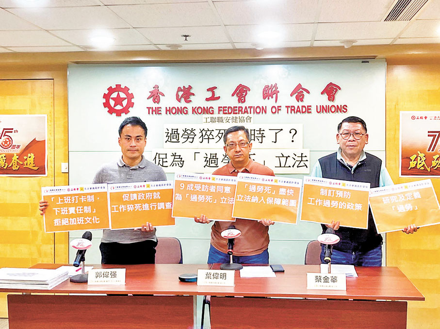 香港一名天星小輪的船長早前懷疑因連續工作23天而身亡,引發社會關注「過勞死」問題。工聯會昨日(17日)公布的一項調查結果顯示,逾半受訪者每周工作逾45小時,更有7.3%受訪者未計加班每周工作逾70小時,遠超國際勞工組織(ILO)建議每周40小時工作時數。同時,有逾65%受訪者下班後仍無償跟進工作,85%受訪者出現過勞症狀。工聯會促請特區政府立法規管過勞工作,及早日制定「標準工時」,保障打工仔生活健康。