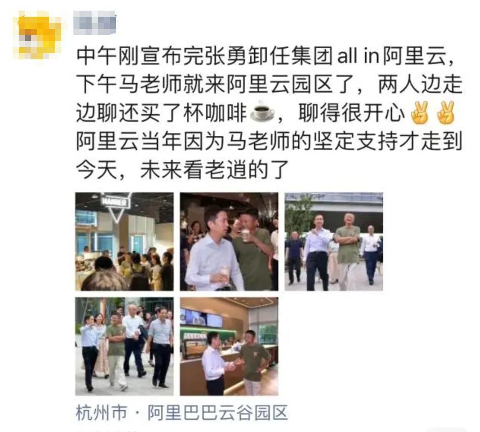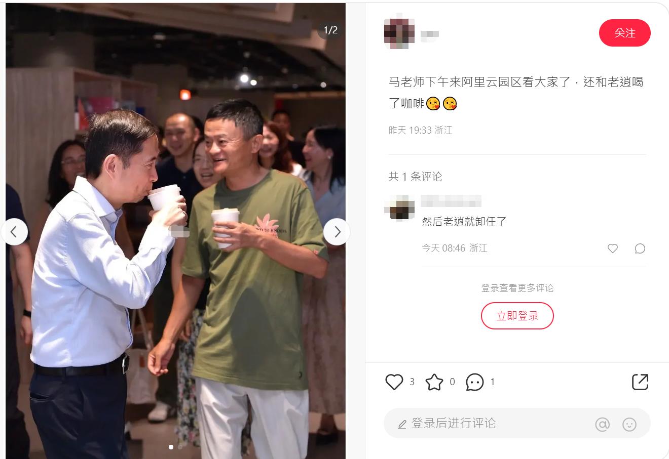 有員工在社交媒體平台上描述,中午宣布老逍all in阿里雲,下午馬雲就去了阿里雲園區;還有員工提及,兩人散步到園區內的咖啡廳,「老逍還請馬老師喝了咖啡」。