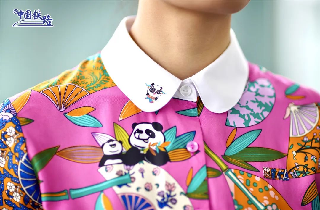 其中,色彩明艷的襯衣式連衣裙上,點綴了極具巴蜀特色的紋樣,襯衫、馬甲上的大熊貓元素,則賦予制服超高辨識度。制服設計還融入竹元素,兩片竹葉交叉相連,形成「心」型造型,象徵「竹到平安行、兩岸心連心」的美好寓意。另一方面,制服帽子的設計打破傳統風格,採用「遮幅式」貝雷帽設計,同時點綴成都客運段標識,展現出乘務人員良好的精神面貌。