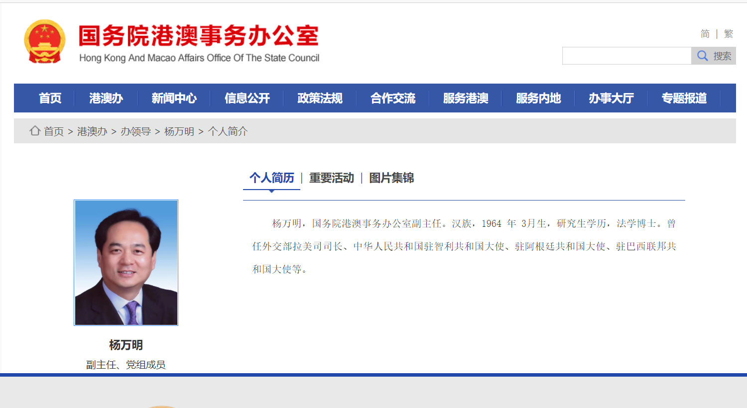 據國務院港澳辦網站顯示,楊萬明現任國務院港澳事務辦公室副主任、黨組成員。楊萬明,漢族,1964年3月生,研究生學歷,法學博士。曾任外交部拉美司司長、中華人民共和國駐智利共和國大使、駐阿根廷共和國大使、駐巴西聯邦共和國大使等。2022年4月,楊萬明任國務院港澳辦副主任。