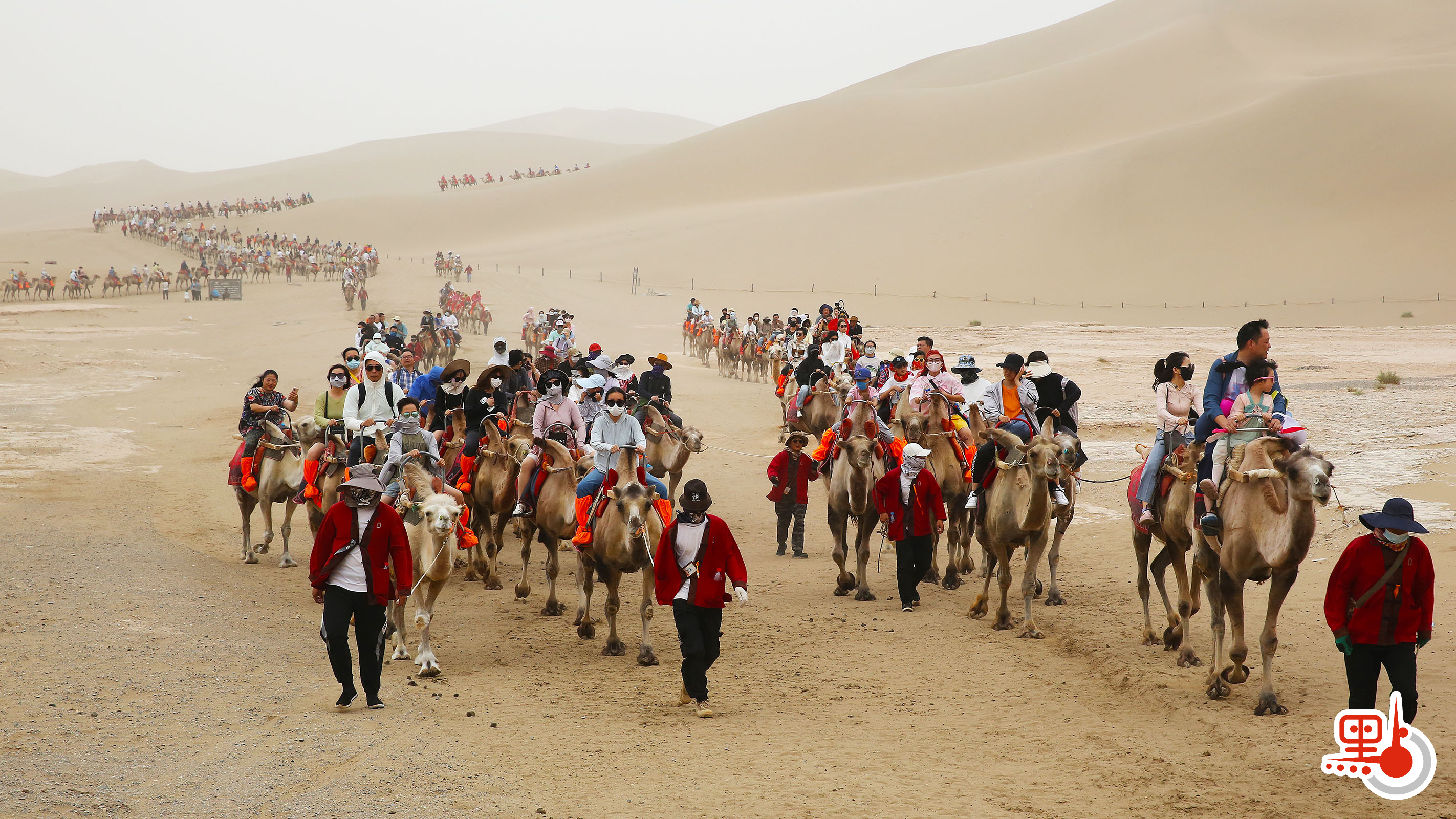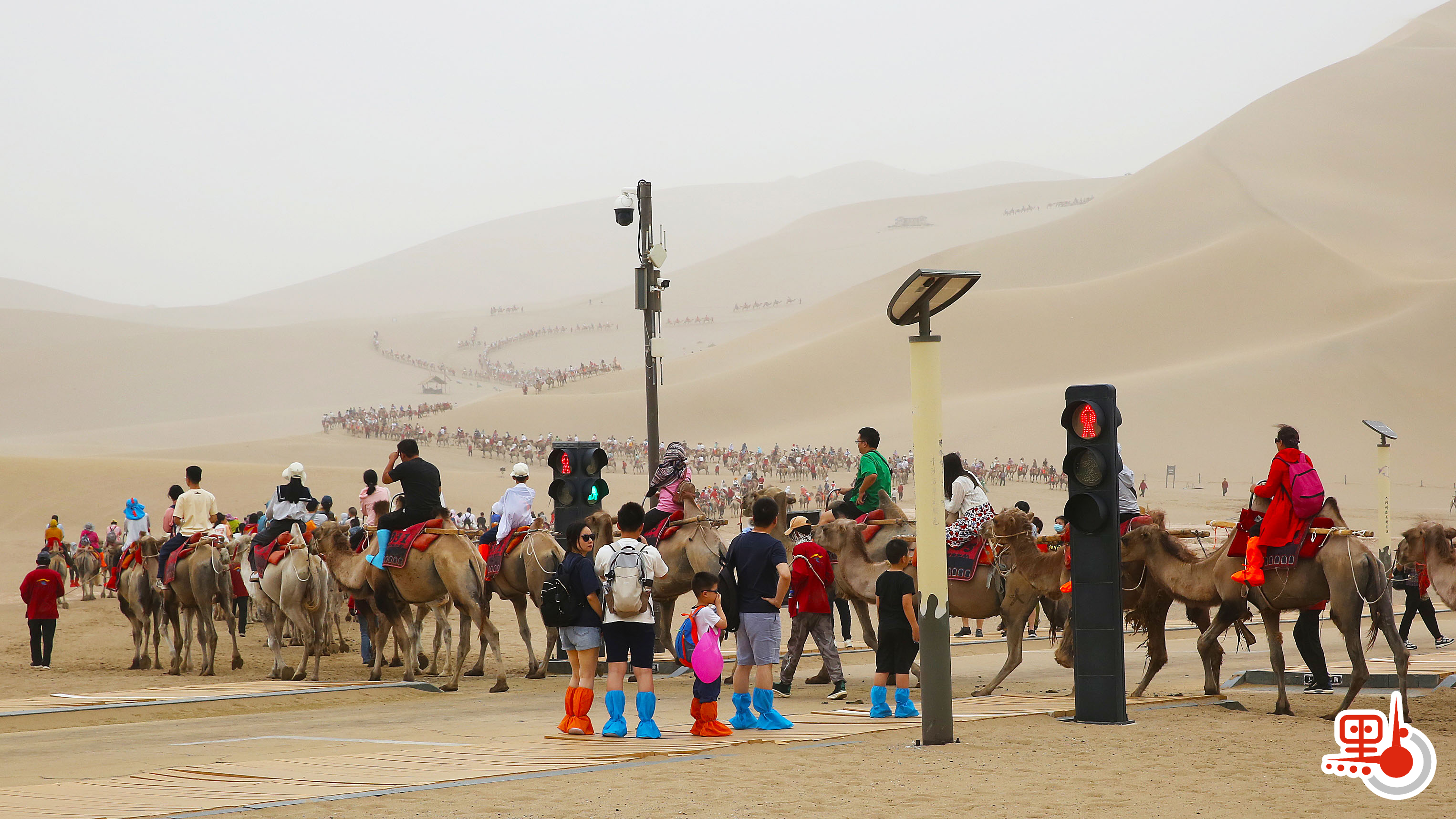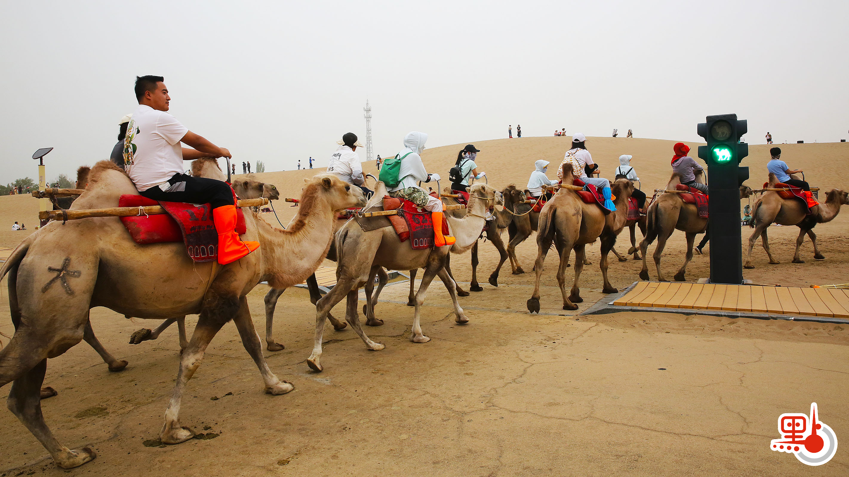 【點新聞報道】隨着暑期到來,甘肅敦煌的旅遊人數不斷攀升。在鳴沙山月牙泉景區,遊客騎着駱駝,沿着鳴沙山腳下穿行,場面十分壯觀。以前只有在小長假期間才會出現的「堵駱駝」現象,這兩天已經成為常態。在行人步道和駱駝通道兩個交叉點設置「駱駝紅綠燈」成為新晉網紅打卡地。