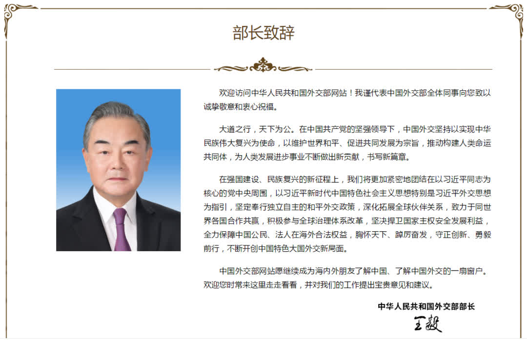 歡迎訪問中華人民共和國外交部網站!我謹代表中國外交部全體同事向您致以誠摯敬意和衷心祝福。