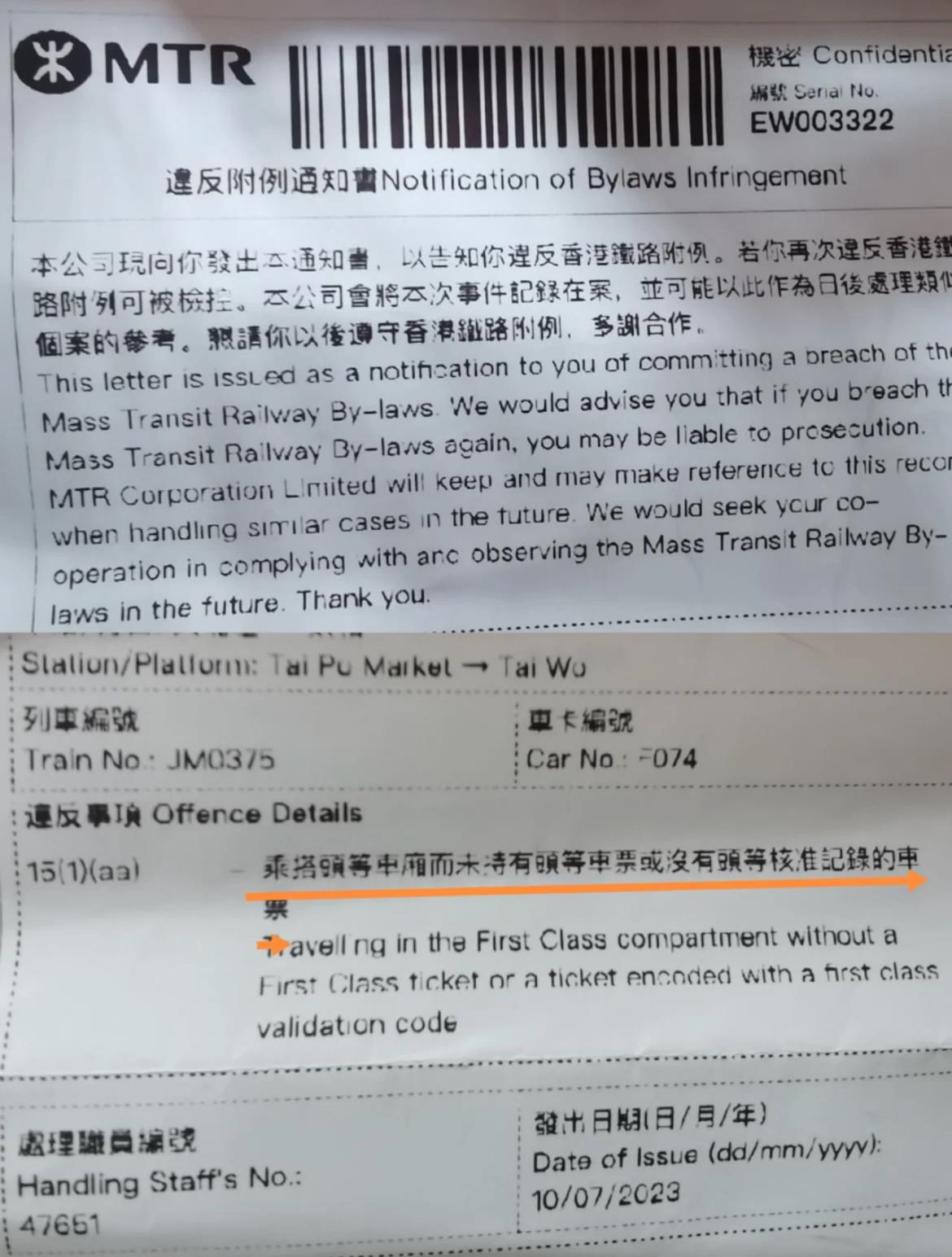 事主上載《違反附例通知書》的相,其中列明她與家人違反的附例為15(1)(aa)「乘搭頭等車廂而未持有頭等車票或沒有頭等核准記錄的車票」。通知書上強調「若你再次違反港鐵附例,可被檢控」,意味今次事主未被控,亦毋須罰款。