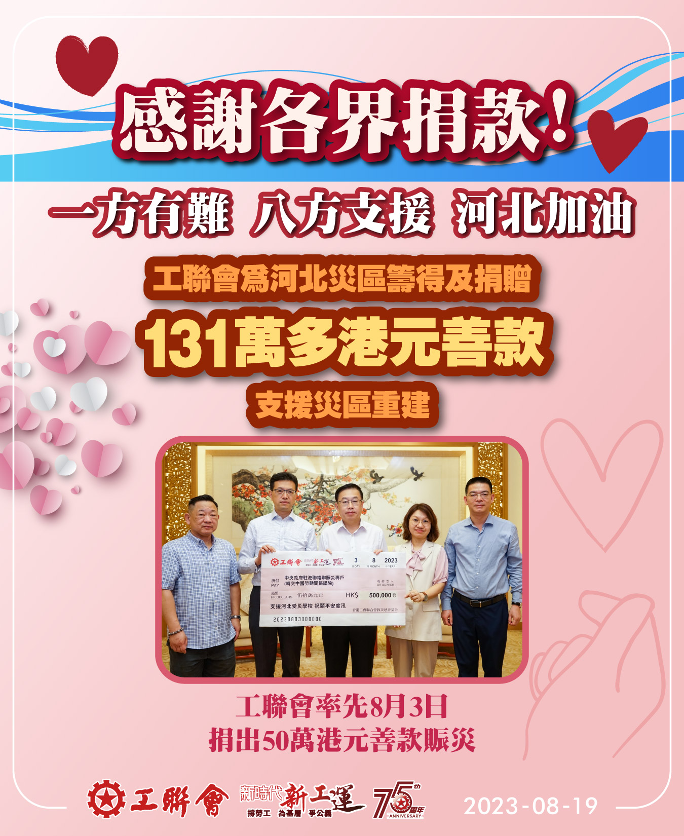 工聯會表示,河北特大降雨導致不少學校及宿舍遭洪水侵襲,大量圖書被浸泡損毀,學校職工和學生被困,情況令人心酸。工聯會非常關心當地災情,特別是學校的受災情況,率先於8月3日從「工聯會救災慈善基金」緊急撥出50萬善款,由會長吳秋北、副會長陳鄧源和副理事長曾志文轉交中央政府駐港聯絡辦副主任何靖代表接收,冀為受災地區的學校提供及時適切的緊急援助。