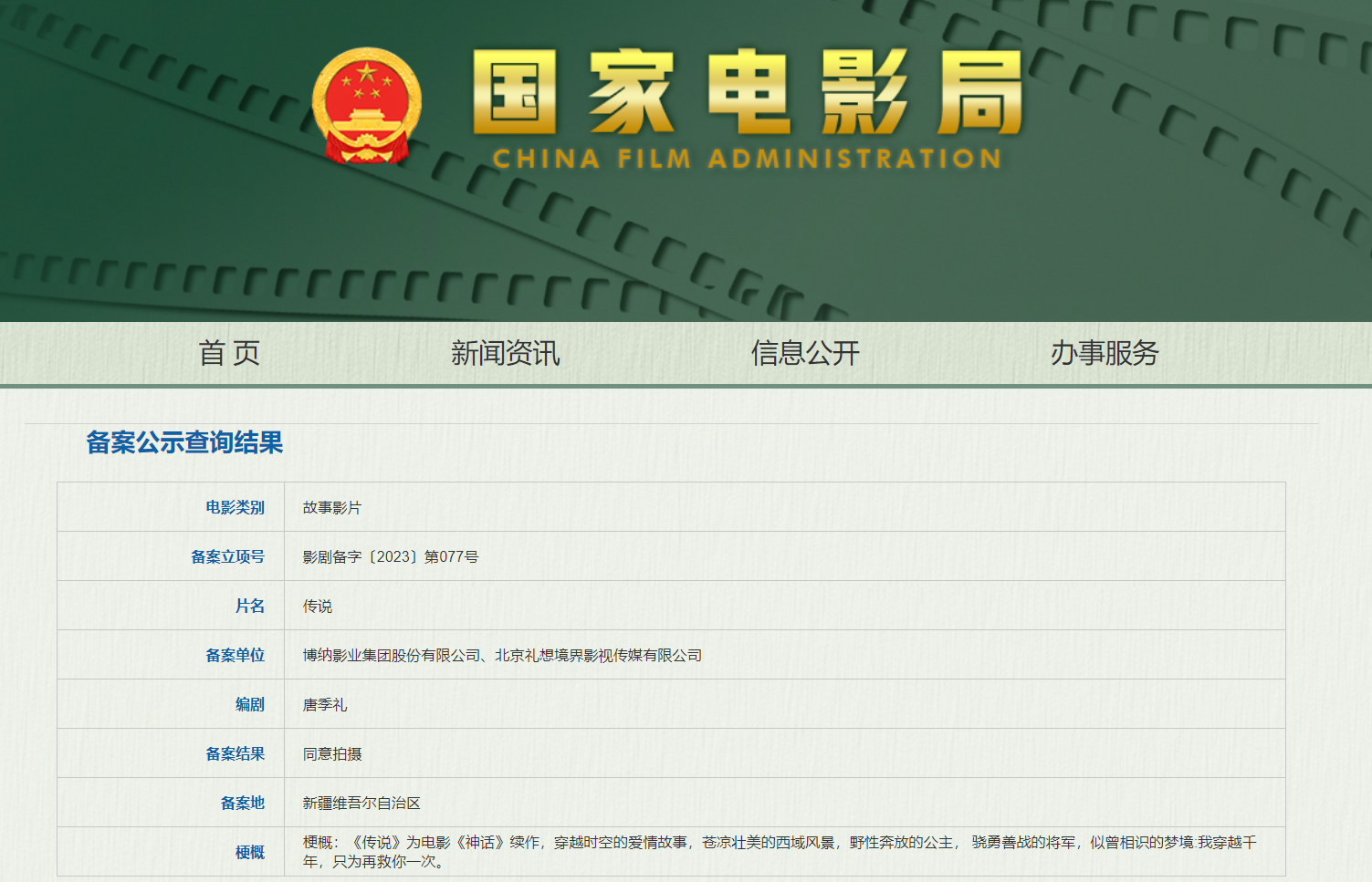 據國家電影局公示信息:電影《神話》的續作《傳說》已正式備案,由唐季禮任編劇。「穿越時空的愛情故事,蒼涼壯美的西域風景,野性奔放的公主,驍勇善戰的將軍,似曾相識的夢境:我穿越千年,只為再救你一次。」