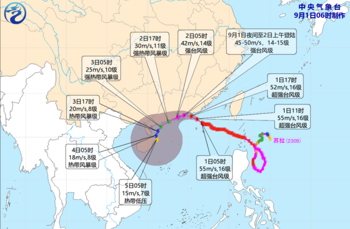 中央氣象台預測,「蘇拉」將於今日夜間到2日上午在廣東惠東到台山一帶沿海登陸(強颱風級,45-50米/秒,14-15級),也不完全排除在廣東中部近岸海面向西偏南方向移動的可能。
