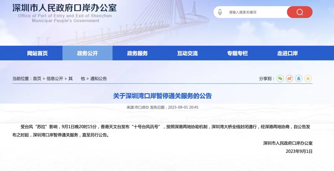 通知稱,受颱風「蘇拉」影響,9月1日晚20時15分,香港天文台發布「十號颱風訊號」,按照深港兩地協助機制,深圳灣大橋全線封閉通行,經深港兩地協商,自公告發布之時起,深圳灣口岸暫停通關服務,直至另行公告。