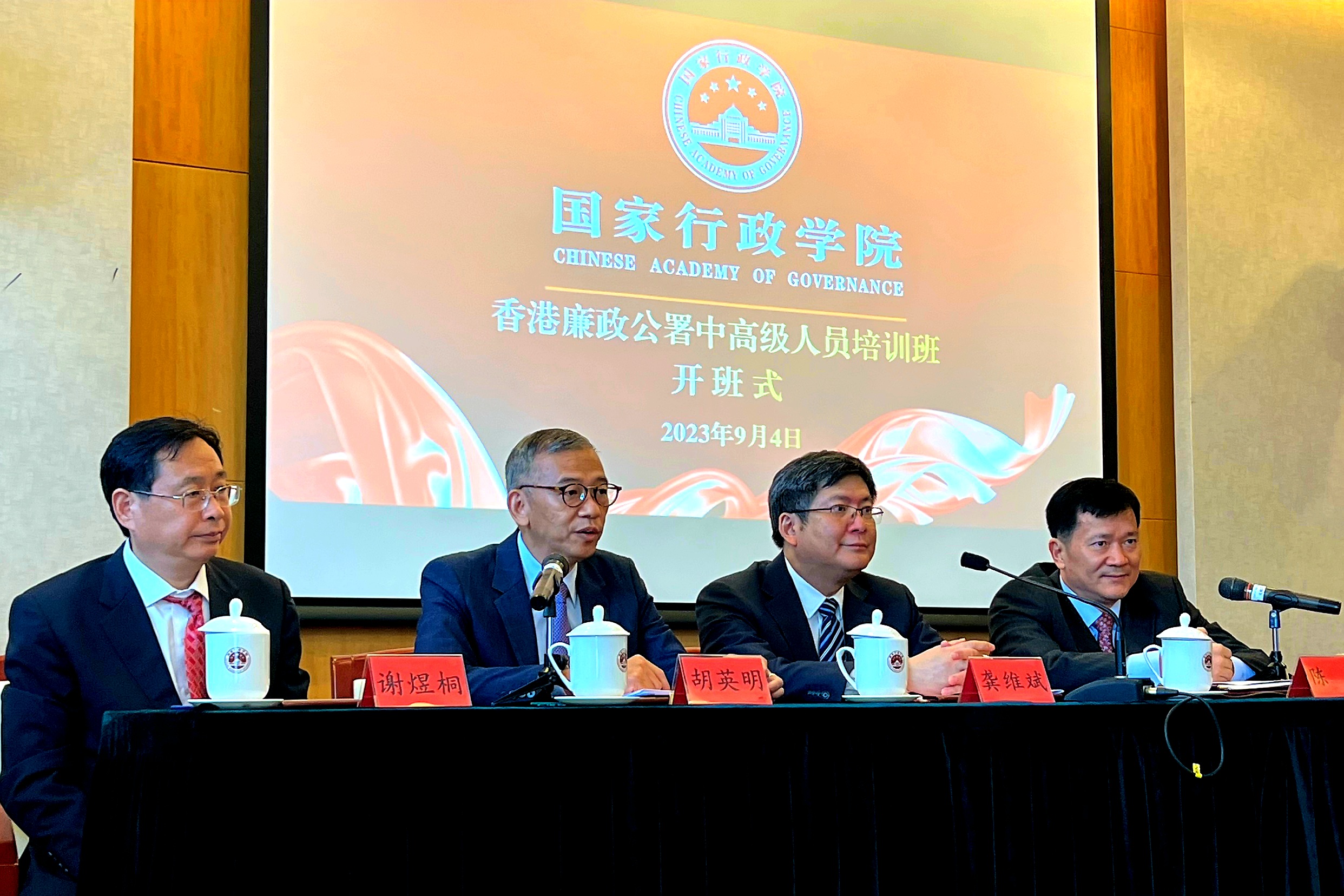 胡英明昨日(3日)飛抵北京,今日(4日)拜訪國家行政學院,了解國家最新的人才培訓及發展情況,並出席有27位中高級廉署人員參與的國情研習班開班儀式。胡英明表示,今次是內地與香港全面通關後,首次在國家行政學院復辦的廉署人員國情研習班。他勉勵廉署人員把握這寶貴機會,加深了解國家現況,開拓自身視野,在各個學習範疇與專家學者多交流。