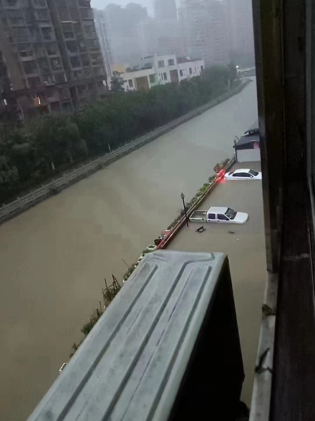 5日晚7時左右開始,福州普降大暴雨。持續的強降雨導致福州路面、內河河道滿溢。在將近夜裏12時左右,記者所在的社區樓群有業主發出樓下車庫漫水的視頻,提醒各業主盡速下樓挪車;又有業主發出雨水從電梯間飛灑而下的視頻。一時間,所有業主心慌慌倉皇奔向地下車庫。一到負二層車庫,大家都大驚失色,水位已漫過了腳踝。「入住這裏二十年,頭一次遇到車庫進水。」大家無不震驚於此次「海葵」帶來的驚人雨量。