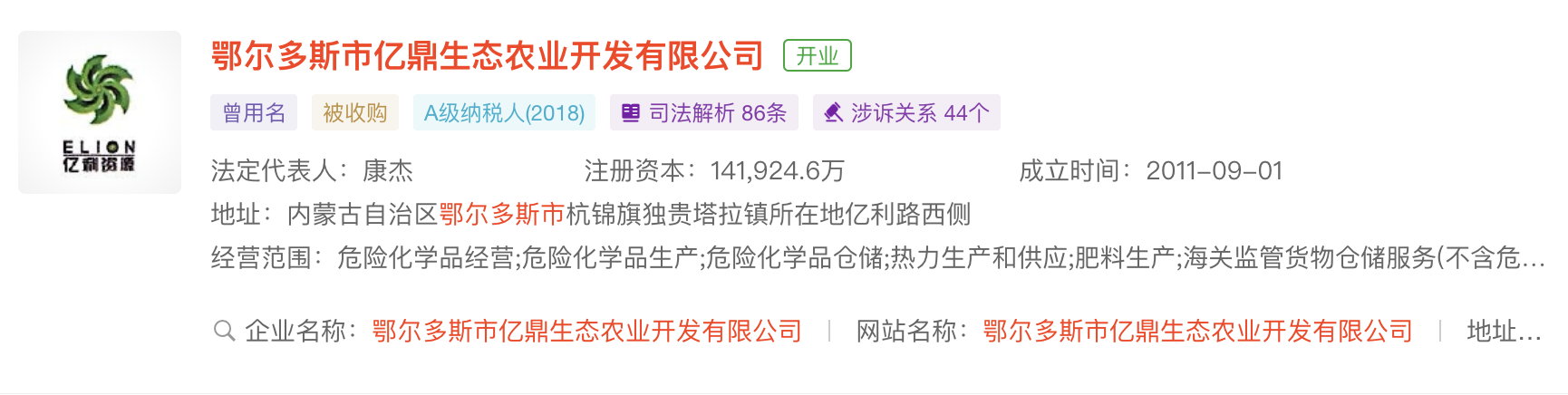 公開資料顯示,鄂爾多斯市億鼎生態農業開發有限公司註冊成立於2011年9月,由億利資源集團有限公司與淄博礦業集團有限責任公司共同出資組建,位於鄂爾多斯市杭錦旗獨貴塔拉工業園區,是一家以從事化學原料和化學製品製造業為主的企業。