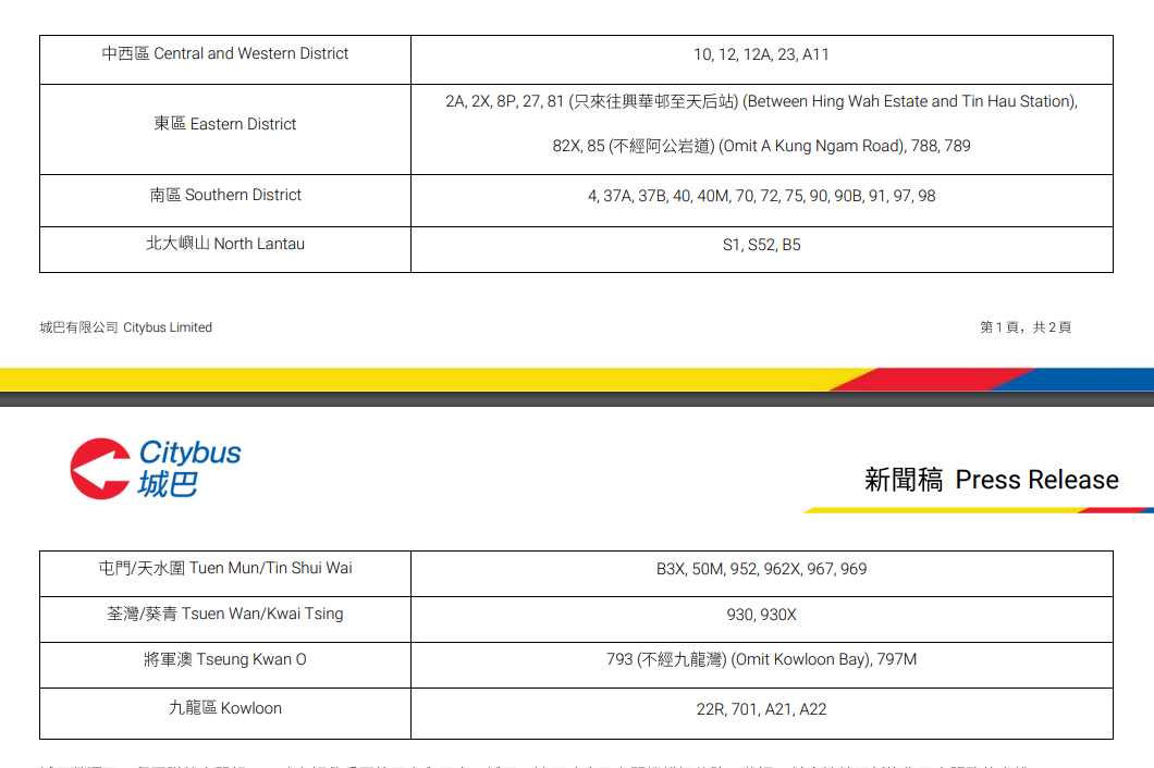 【16:21】城巴以下巴士路線提供有限度服務: