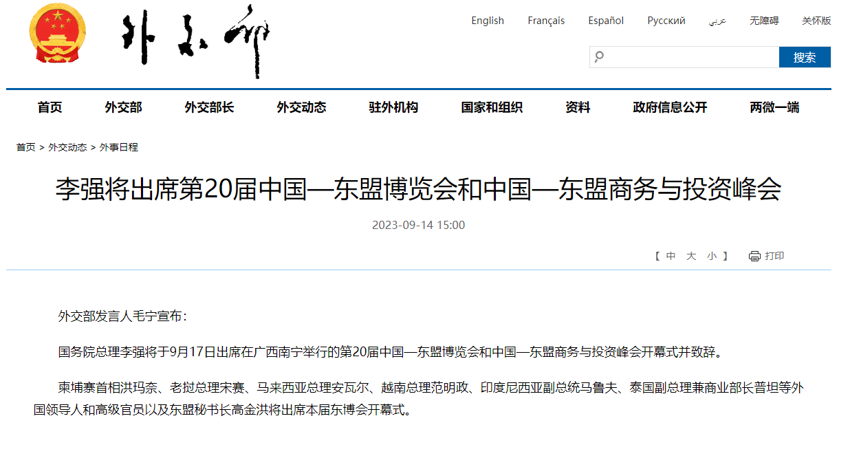 【點新聞報道】外交部發言人毛寧今日(14日)宣布,國務院總理李強將於9月17日出席在廣西南寧舉行的第20屆中國—東盟博覽會和中國—東盟商務與投資峰會開幕式並致辭。