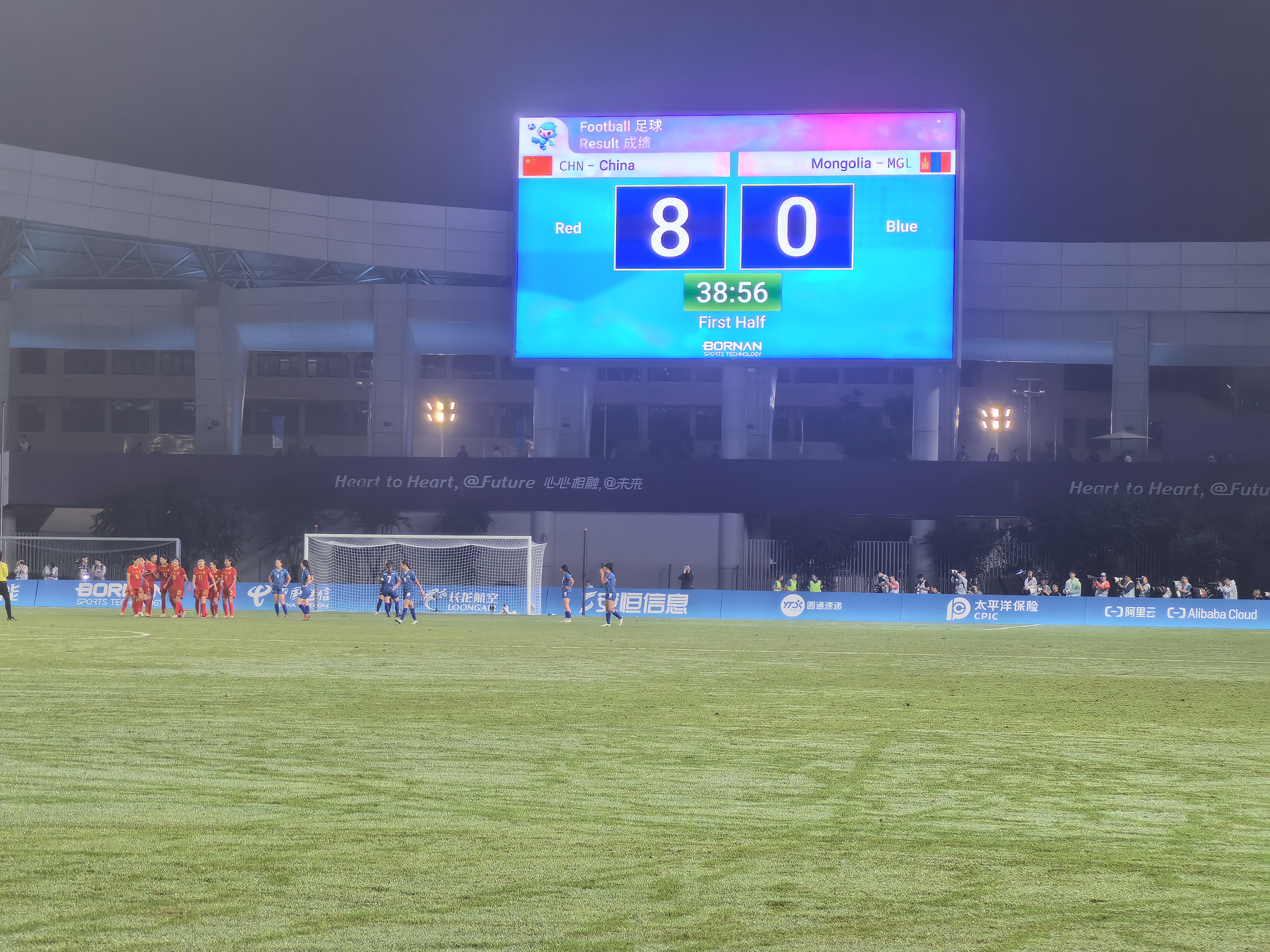 上半場結束,中國女足8:0蒙古女足。王霜大四喜,王珊珊梅開二度,楊莉娜、劉艷秋各入一球。