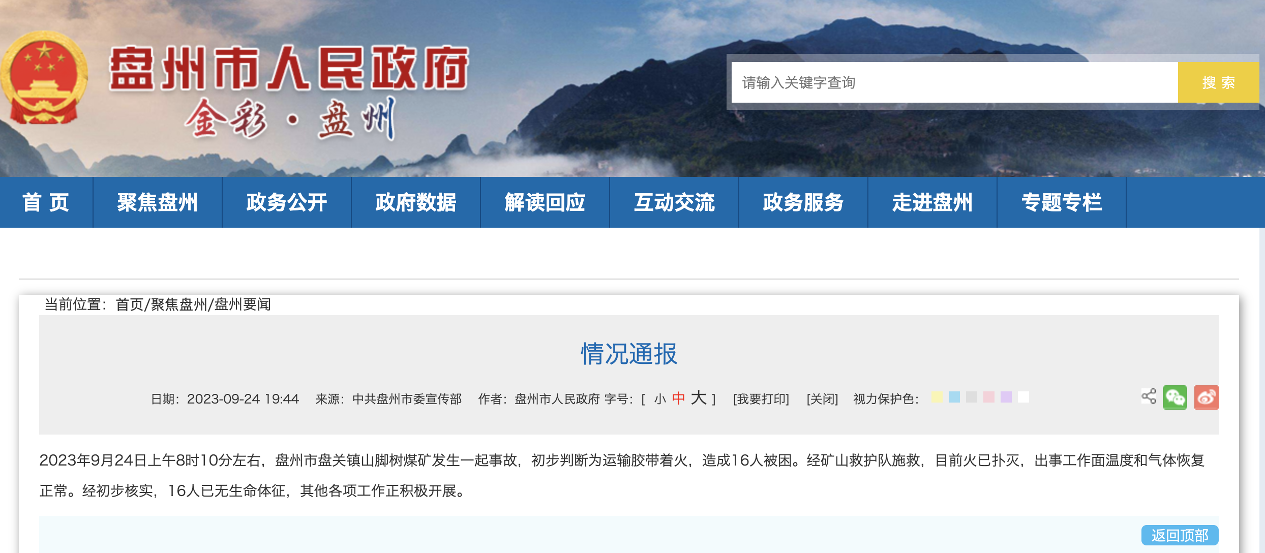 【點新聞報道】貴州省盤州市人民政府網站今日(24日)發布通報稱,今日上午8時10分左右,盤州市盤關鎮山腳樹煤礦發生一起事故,初步判斷為運輸膠帶着火,造成16人遇難。