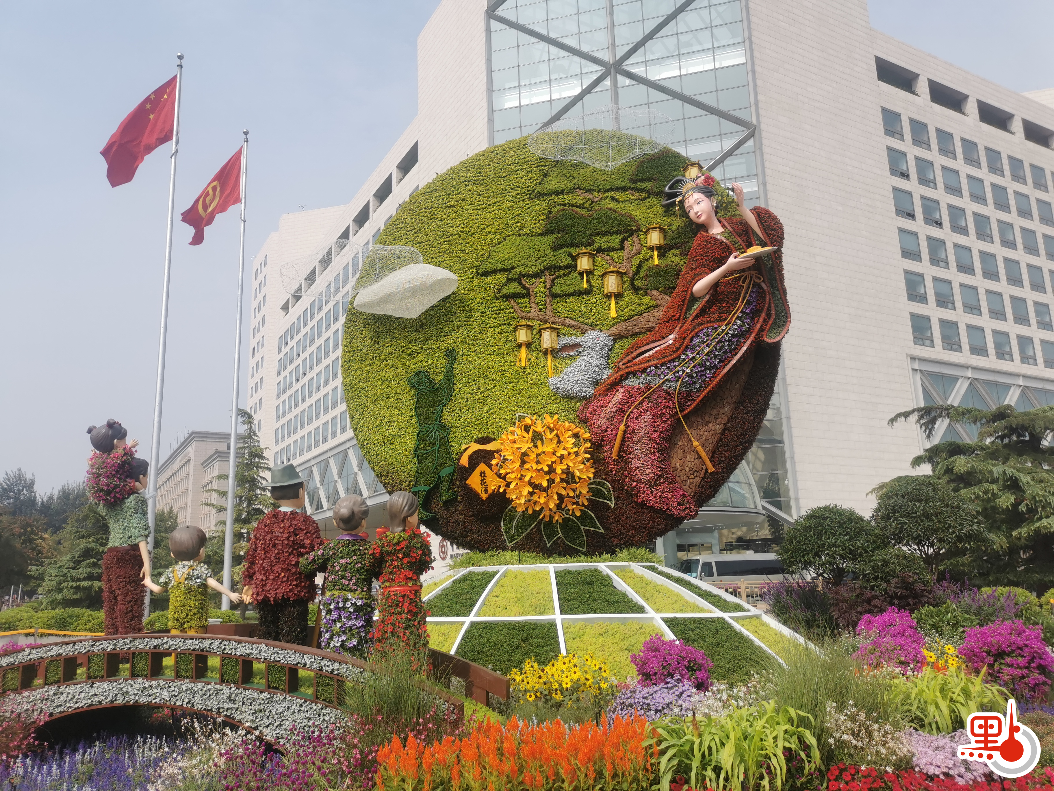 在西單西北角的「花好月圓」花壇頂高8米,以一家人中秋團聚的溫馨畫面為場景,體現了花好月圓下百姓幸福生活。其中,各種花卉布置的「嫦娥奔月」形象逼真,可以清晰看見「嫦娥」手中盤子裏擺放着象徵團圓和美的月餅。