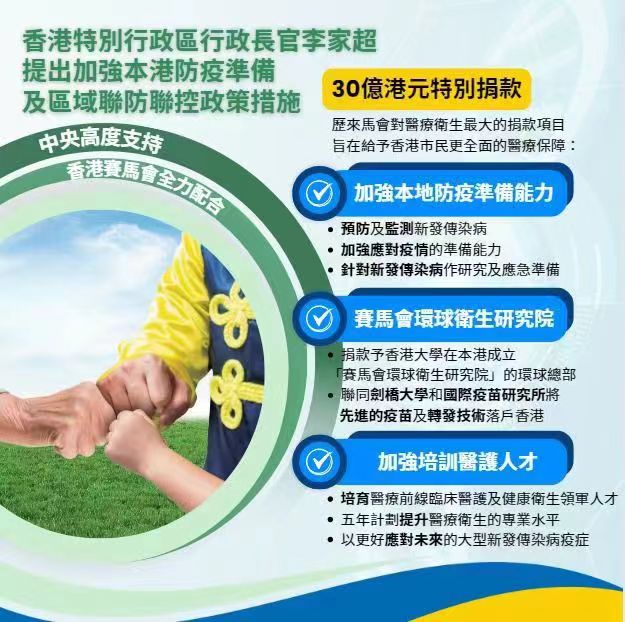 馬會將支持醫務衞生局和衞生防護中心,全方位加強準備並應對未來傳染病爆發的工作。三項具體措施包括:預防及監測新發傳染病;加強應對疫情的準備能力;針對新發傳染病作研究和應急準備。此等措施亦會鞏固在大灣區的聯防聯控區域性合作。