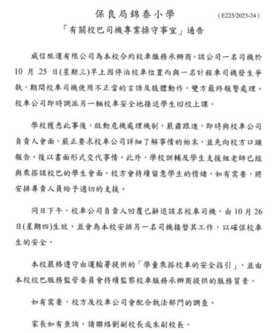 今日(26日)網上流傳保良局錦泰小學一張「有關校巴司機專業操守事宜」的通告,指校方知悉事件後已啟動危機處理機制,嚴肅跟進,並要求校車公司詳加了解事情始末,要先向校方口頭報告,後以書面形式交代事情。而學校訓輔及學生支援組老師已經與乘搭校巴的學生會面,並會持續留意學生的情緒。