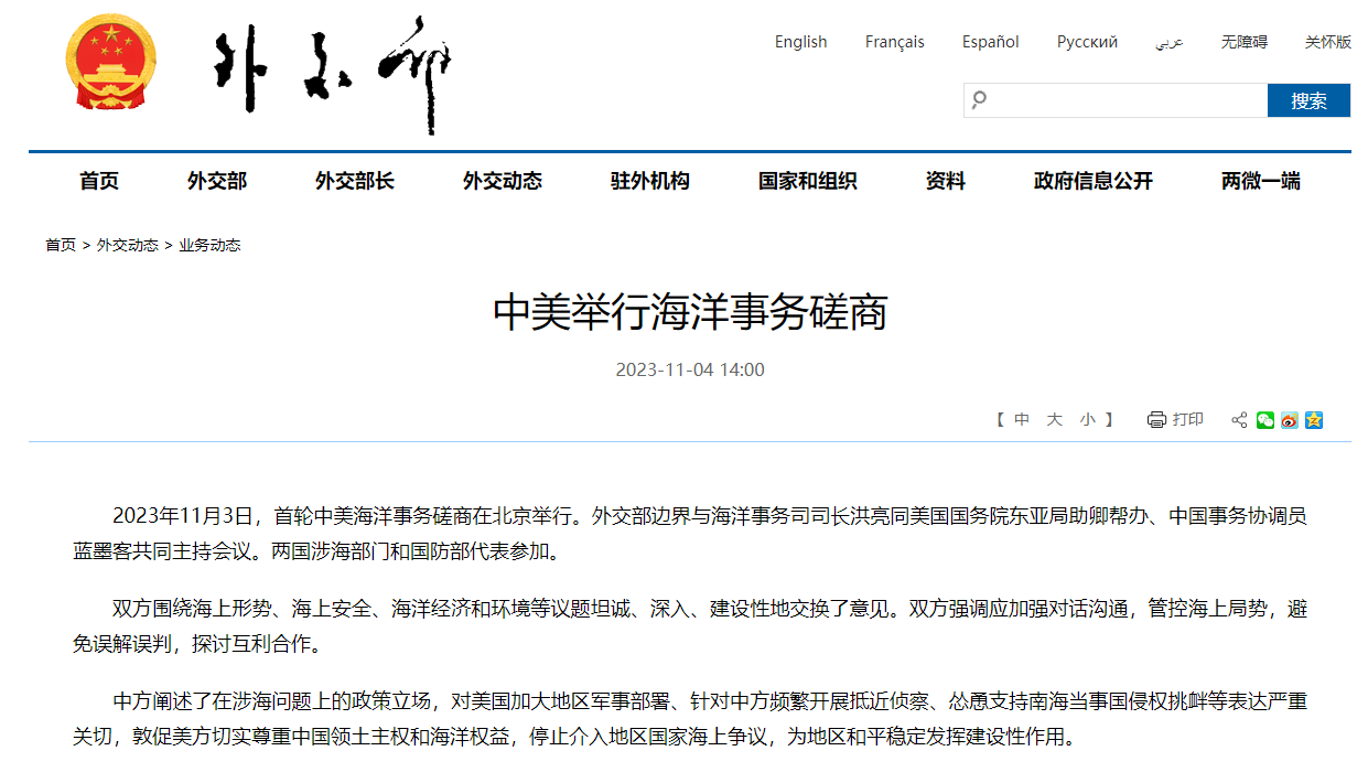 據外交部網站消息,11月3日,首輪中美海洋事務磋商在北京舉行。外交部邊界與海洋事務司司長洪亮同美國國務院東亞局助卿幫辦、中國事務協調員藍墨客共同主持會議。兩國涉海部門和國防部代表參加。