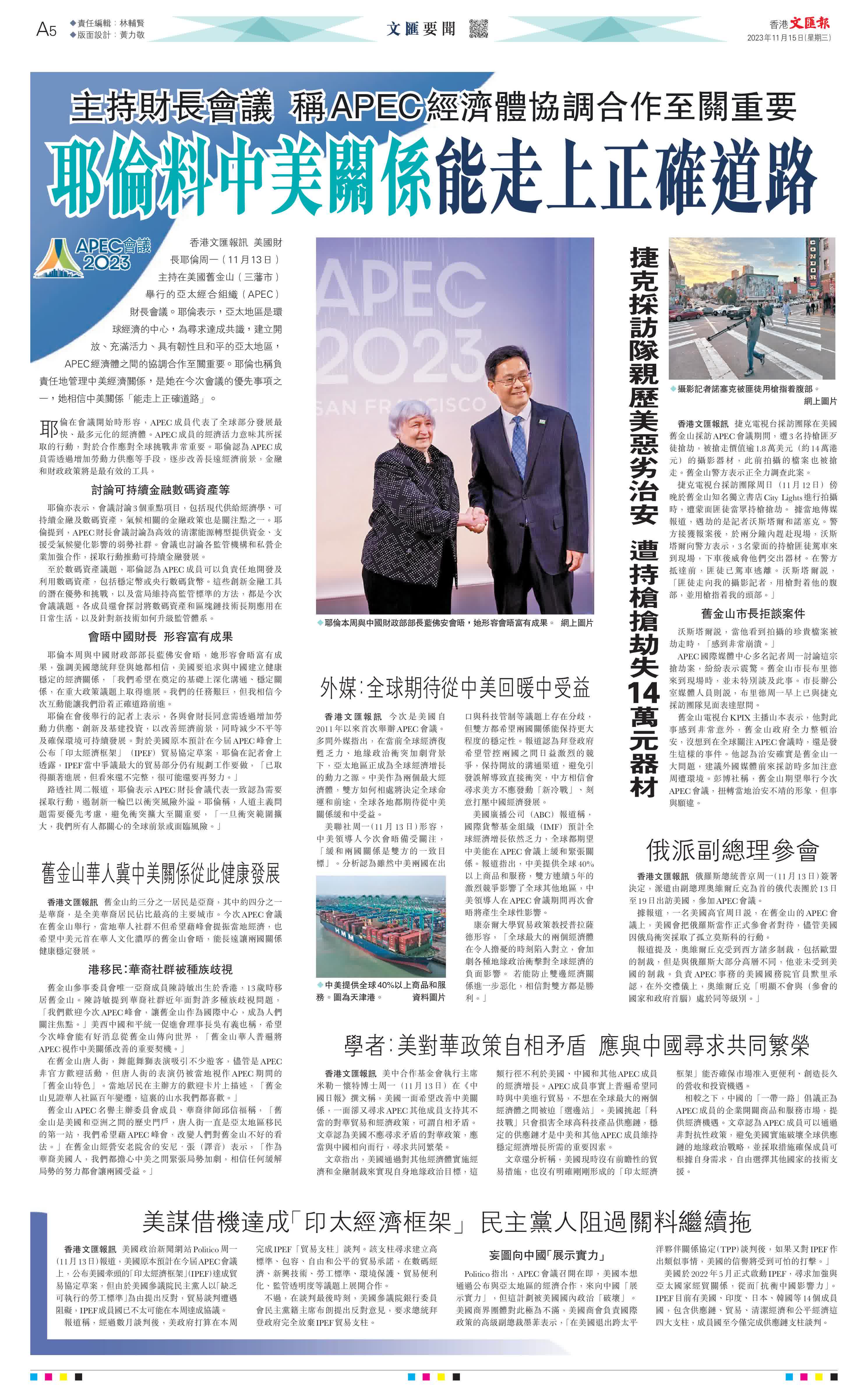 耶倫在會後舉行的記者上表示,各與會財長同意需透過增加勞動力供應、創新及基建投資,以改善經濟前景,同時減少不平等及確保環境可持續發展。對於美國原本預計在今屆APEC峰會上公布「印太經濟框架」(IPEF)貿易協定草案,耶倫在記者會上透露,IPEF當中爭議最大的貿易部分仍有規劃工作要做,「已取得顯著進展,但看來還不完整,很可能還要再努力。」
