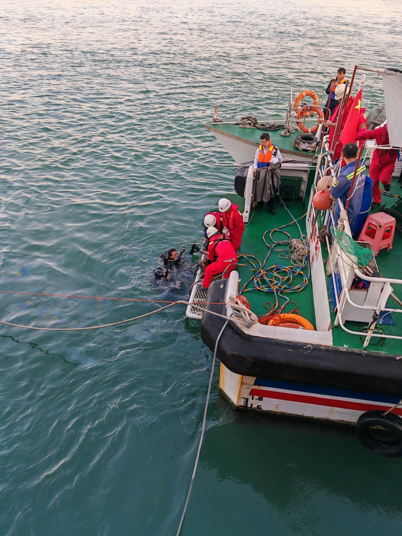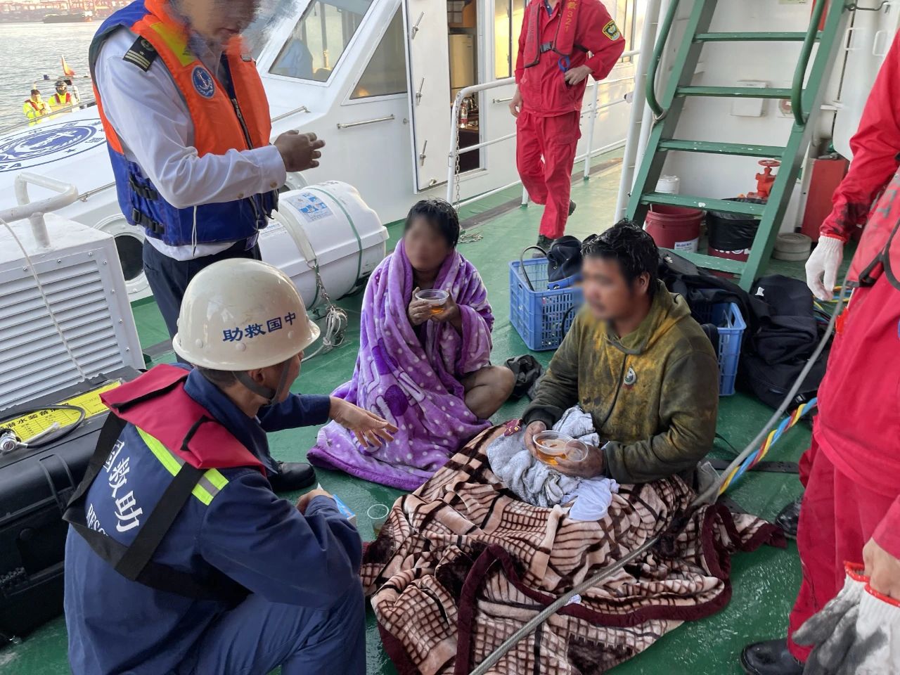 6時40分,「南海救321」艇抵達事發水域。現場開展風險評估後,為避免次生意外,立即組織對翻扣漁船進行綁定加固處理,由救助潛水員下水搜尋。「救助蛙人」仔細探摸,數分鐘後便發現2名遇險人員。經救助人員2人2次下水施救,被困在翻扣船機艙中的遇險中年夫妻倆先後被營救上岸。