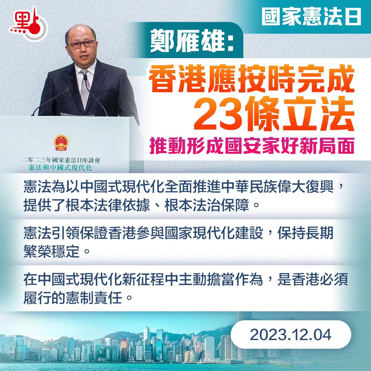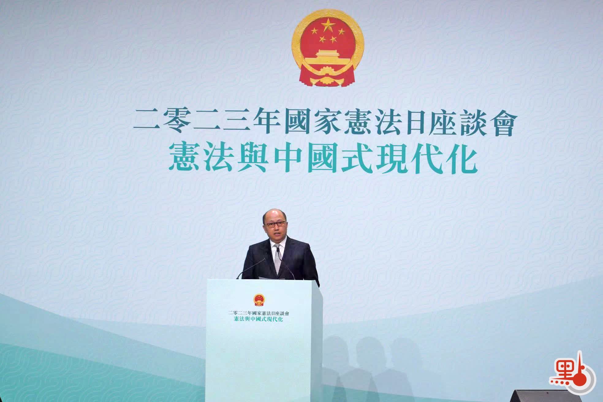 【點新聞報道】今年12月4日是第10個國家憲法日。香港特區政府、中央政府駐港聯絡辦共同舉辦2023年國家憲法日座談會,主題為「憲法與中國式現代化」。香港特區行政長官李家超、中央政府駐港聯絡辦主任鄭雁雄出席並致辭。鄭雁雄在致辭時表示,今天是第十個國家憲法日,也是香港連續第七年舉辦國家憲法日的座談會。這次座談會聚焦憲法與中國式現代化開展研討,對於全面把握中國式現代化的憲法邏輯,推動香港更好地抓住中國式現代化的機遇,在服務國家發展大局的進程中,更好促進自身發展具有重大意義。