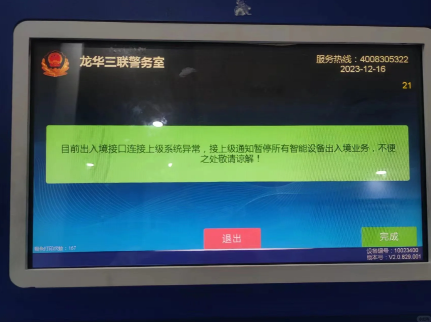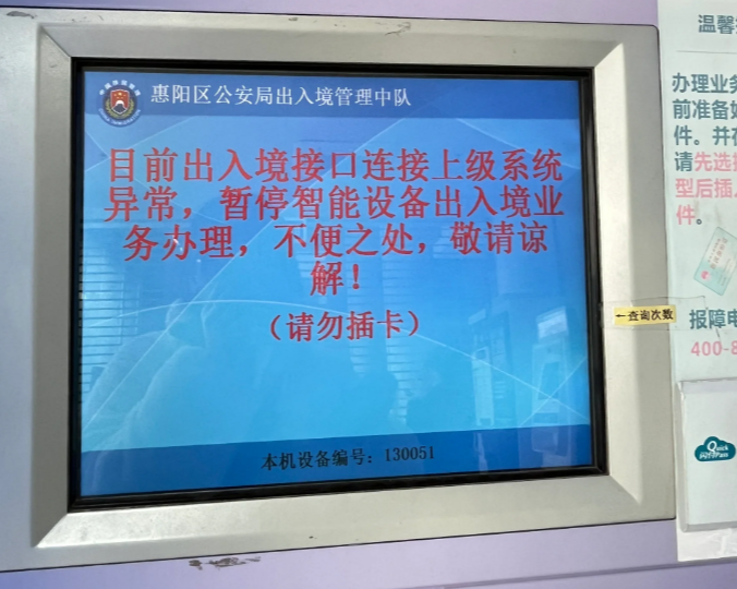 據網友爆料,昨日起,在深圳多個智能簽注服務點簽注失敗,機器上亦寫有「目前出入境接口連接上級系統異常,接上級通知暫停所有智能設備出入境業務,不便之處敬請諒解」字樣,有在珠海、廣州、惠州等地的網友亦表示無法辦理簽注。不過,仍有幸運網友可成功辦理,惟能否簽注成功「靠運氣」,有人簽注失敗後,換機可簽注成功,亦有人需要更換服務點嘗試,不少人簽注失敗失望而歸,出行計劃被打亂。