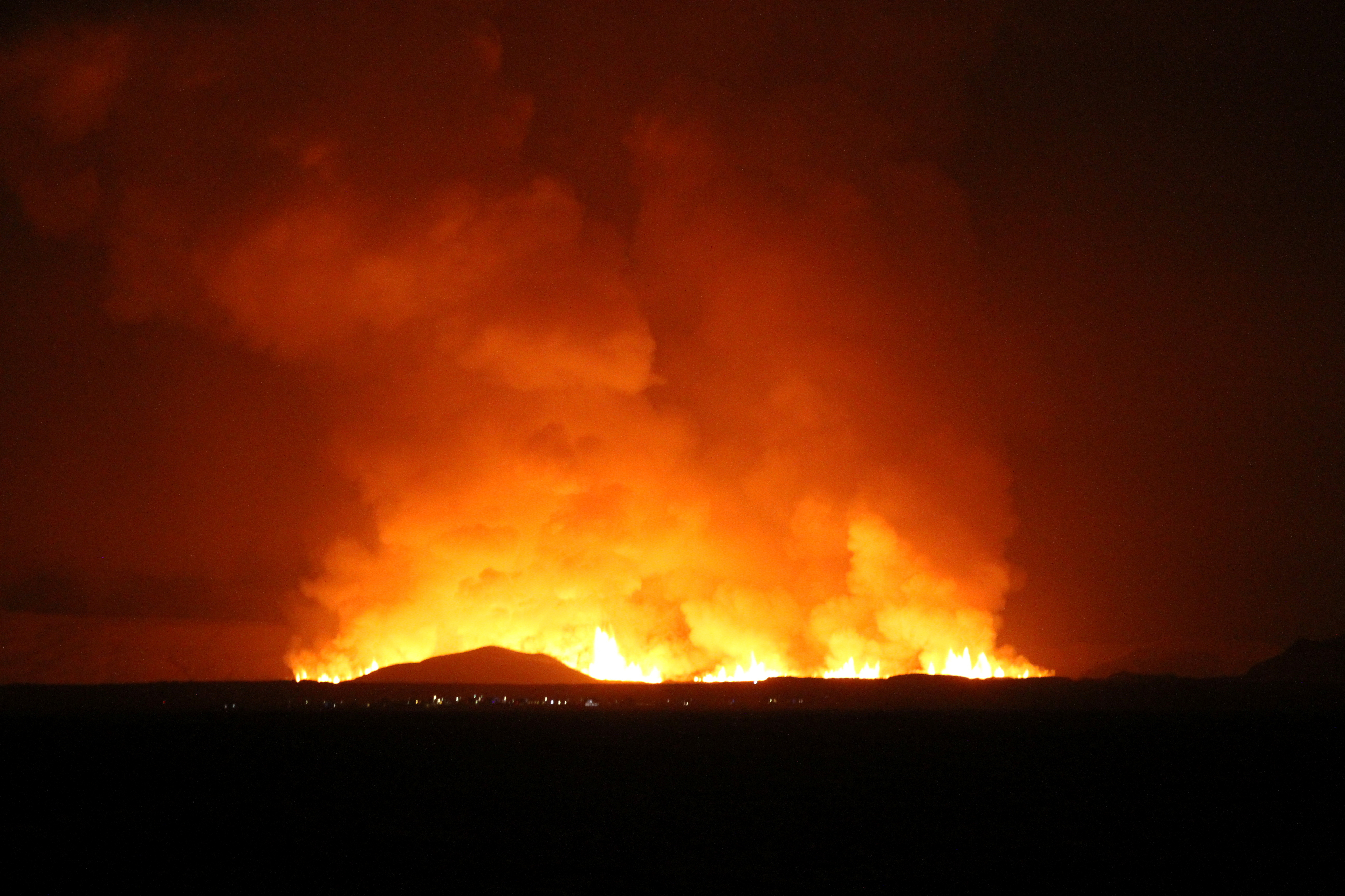 圖片顯示,火山爆發後大量岩漿噴出,位於格林達維克東北方約42公里的冰島首都雷克雅未克亦可見到火山爆發的情況。
