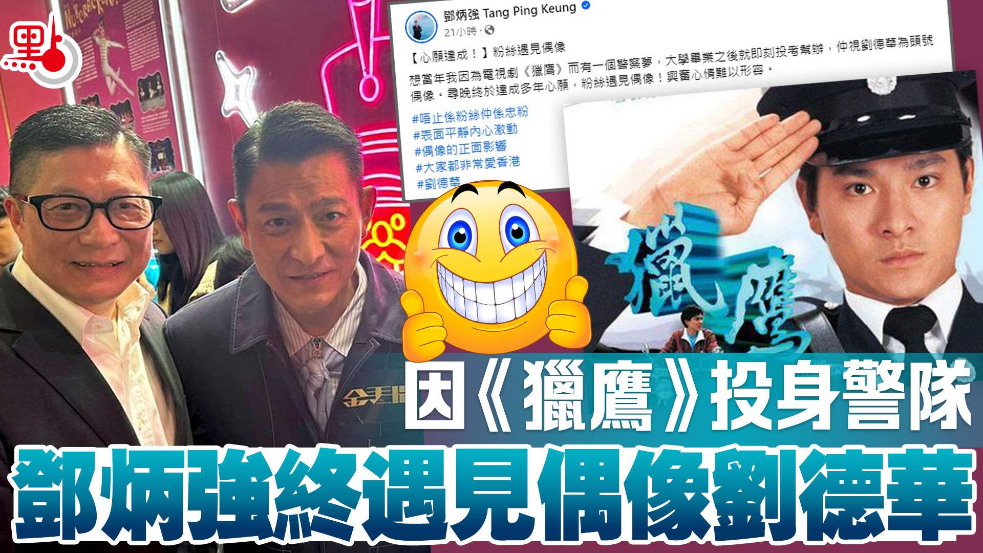 鄧炳強上載與劉德華肩並肩的合照,表示「想當年我因為電視劇《獵鷹》而有一個警察夢,大學畢業之後就即刻投考幫辦,仲視劉德華為頭號偶像。尋晚終於達成多年心願,粉絲遇見偶像!」他還hashtag表明「唔止係粉絲仲係忠粉」、「表面平靜內心激動」、「偶像的正面影響」、「大家都非常愛香港」。