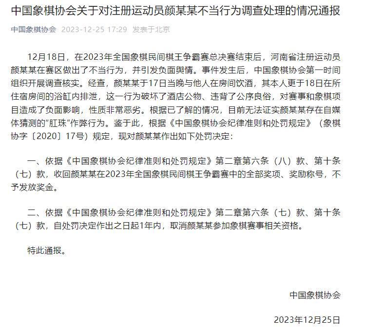 12月25日,中國象棋協會發布情況通報,稱經查,顏某某於17日當晚與他人在房間飲酒,其本人更於18日在所住宿房間的浴缸內排洩,這一行為破壞了酒店公物、違背了公序良俗,對賽事和象棋項目造成了負面影響,性質非常惡劣。最終,中國象棋協會收回顏某某在2023年全國象棋民間棋王爭霸賽中的全部獎項、獎勵稱號,不予發放獎金,並且自處罰決定作出之日起1年內,取消顏某某參加象棋賽事相關資格。