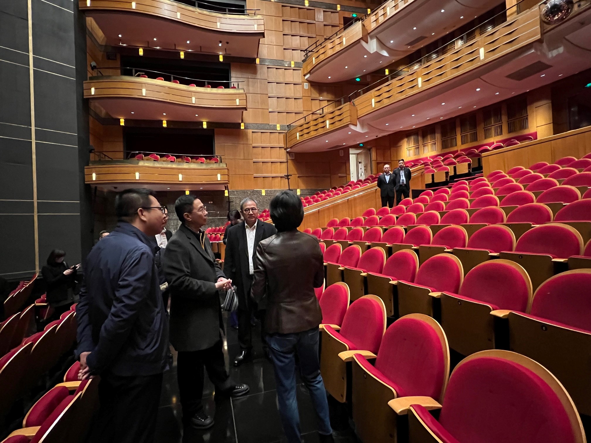 楊潤雄與文化體育及旅遊局常任秘書長黃智祖等一行,今日下午參觀上海大劇院,了解當地為演藝團體提供的場地和設施配套。