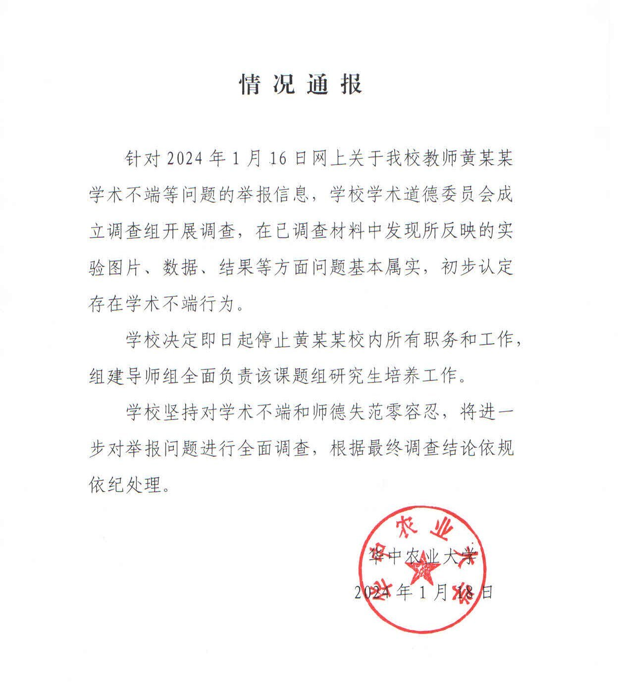 【點新聞報道】今日(19日)凌晨,華中農業大學在官方微博發布情況通報。通報說,針對2024年1月16日網上關於華中農業大學教師黃某某學術不端等問題的舉報信息,學校學術道德委員會成立調查組開展調查,在已調查材料中發現所反映的實驗圖片、數據、結果等方面問題基本屬實,初步認定存在學術不端行為。學校決定即日起停止黃某某校內所有職務和工作,組建導師組全面負責該課題組研究生培養工作。