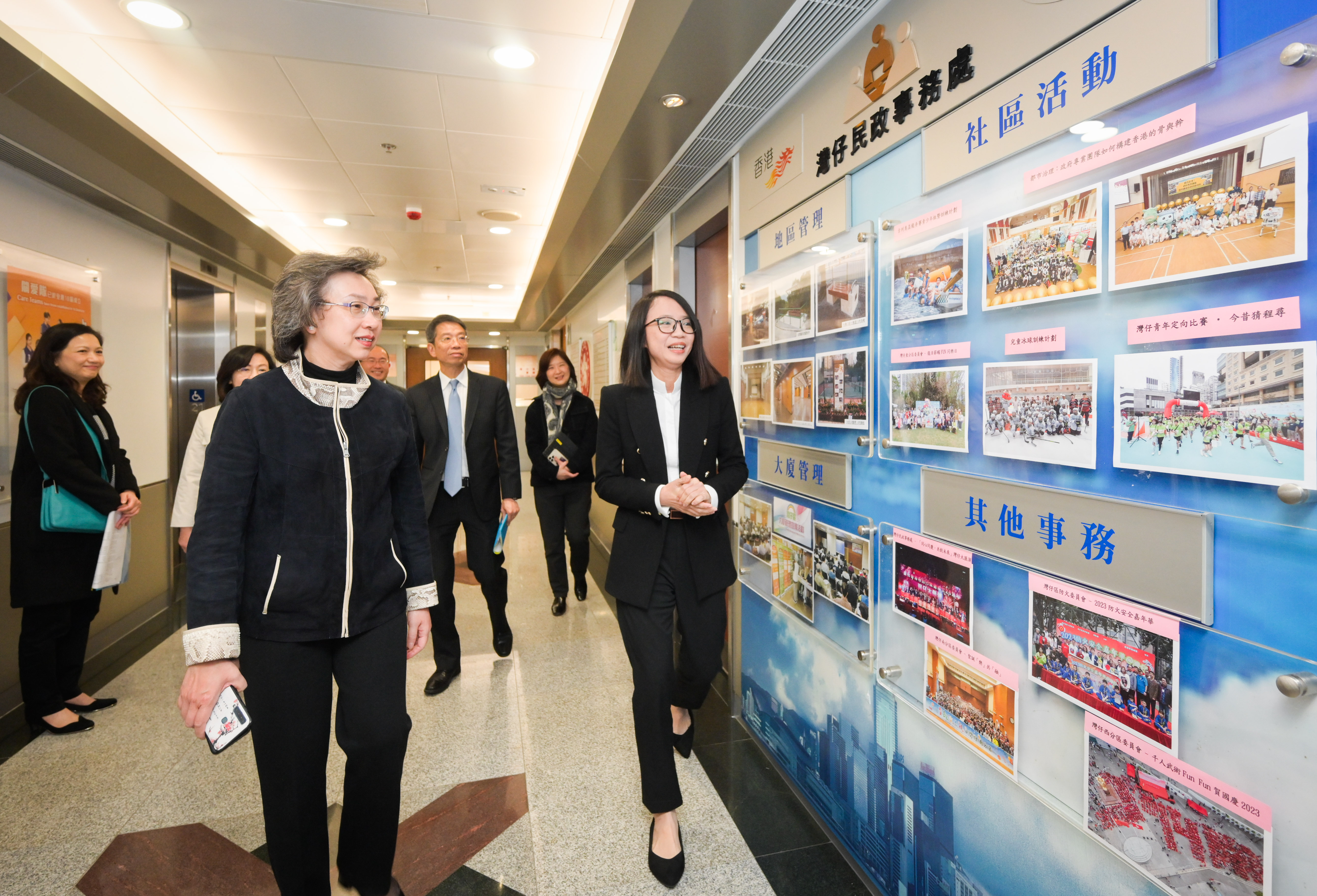 她分別探訪負責支援和監察「地區服務及關愛隊伍」、支援大廈管理和推廣社會企業的組別。她聆聽前線人員簡介如何與各區共452支「關愛隊」協調,加強支援地區工作和地區網絡。楊何蓓茵欣悉各區民政事務處將與區議會攜手,在農曆新年前與當區「關愛隊」合作,在區內推出一系列關愛行動,為區內長者和有需要人士送上關懷和支援。