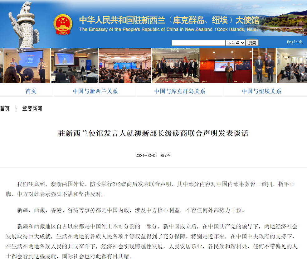 【點新聞報道】澳新兩國外長、防長舉行2+2磋商後發表聯合聲明,其中部分內容對中國內部事務說三道四、指手畫腳,中國駐新西蘭使館發言人今日(2日)對此表示強烈不滿和堅決反對。