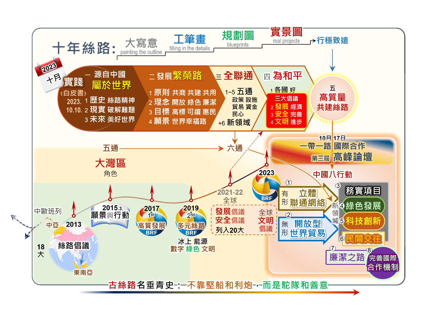 然而,單靠發展未能保證國泰民安。第一屆論壇焦點是「高質量」的「五通」;第二屆深化為多元絲路(數字、綠色和文明等);今年再涵蓋三個新倡議:「全球發展倡議」(註三)、「全球安全倡議」(註四)和「全球文明倡議」(註五)。三大倡議列入「重大實踐」白皮書內,且設於「為世界和平與發展」標題的段落之下(註六),反映人類更需要和平。