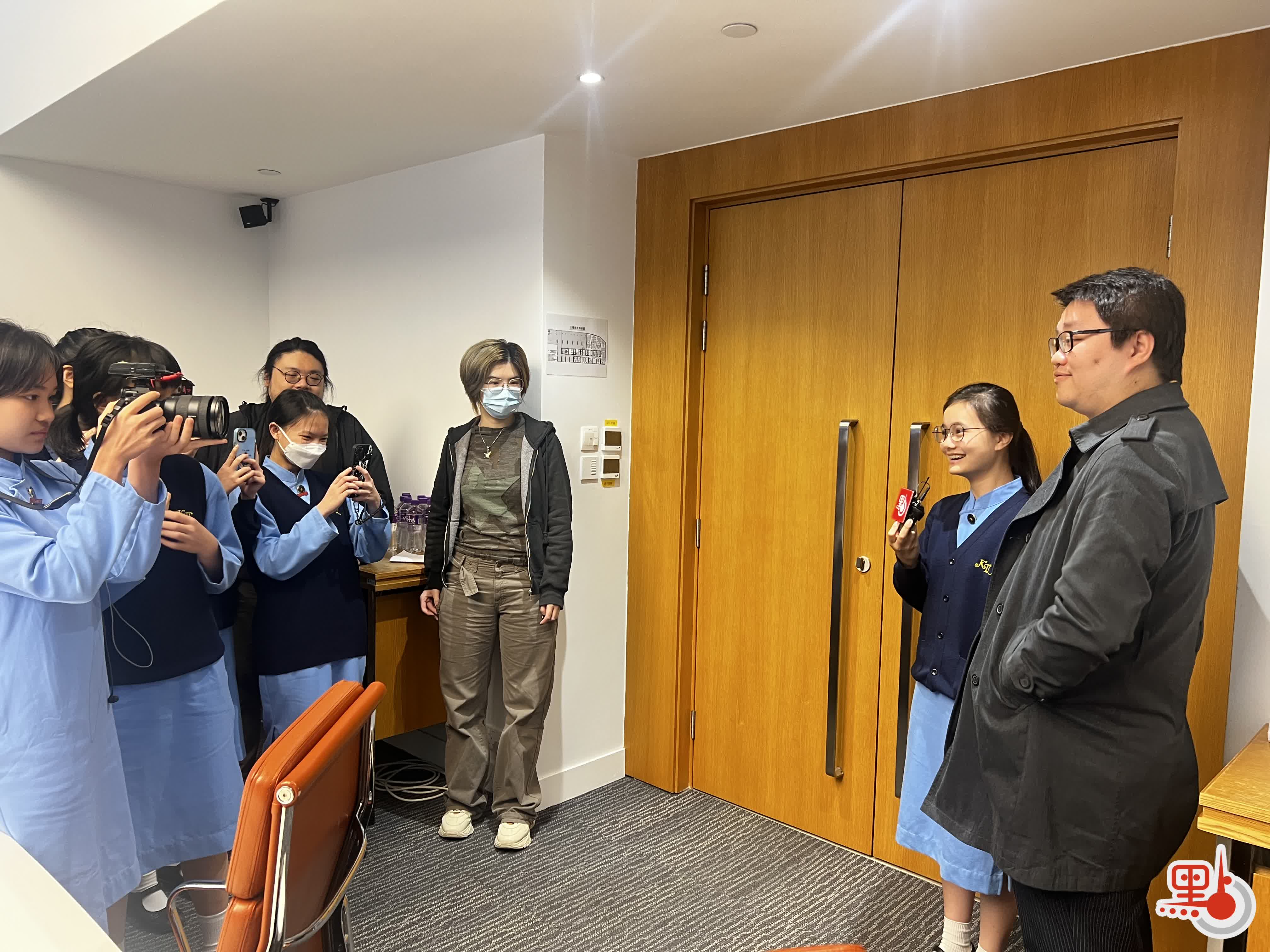 從報史館走出,就來到大公文匯集團的全媒體中心。全媒體融媒工作部總監陶亮帶同學們參觀了全媒體中心主播組、新聞編輯部、國際新聞部的工作。在製作新媒體節目的直播控制平台,同學們欣賞了《點觀香港》節目的數字人主播模式,以及演播室的演播設備。隨後,陶亮介紹了大公文匯的新媒體平台矩陣,無論是小紅書、抖音、Bilibili、YouTube、Facebook等平台,都有大文平台的身影。