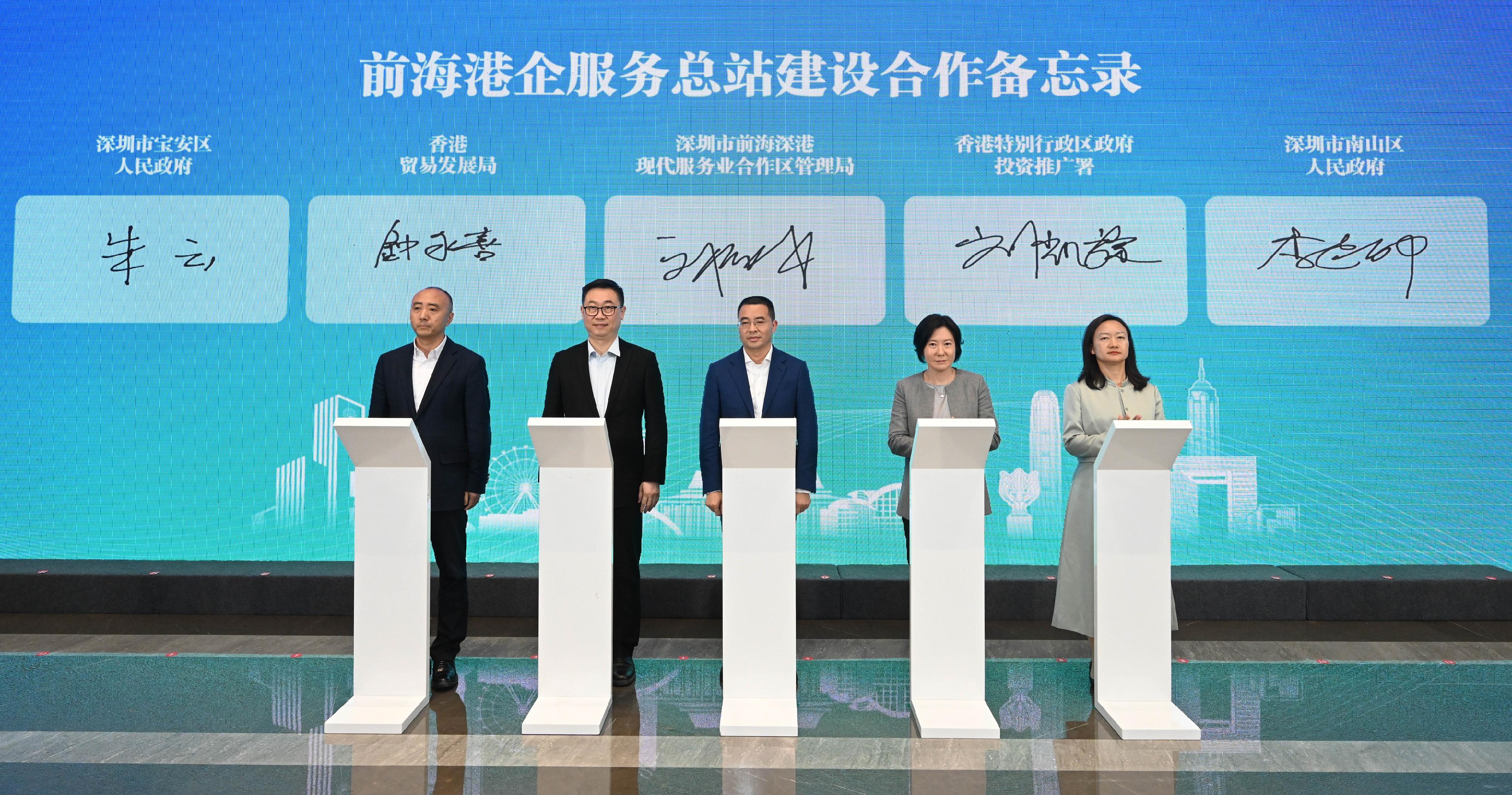 此外,深圳市前海管理局聯同香港投資推廣署、香港貿易發展局、深圳市南山區及寶安區政府,在會上簽署合作備忘錄,共同合作設立「前海港企服務總站」,為港人港企在深圳前海創業、投資、生活等一站式服務。