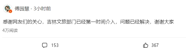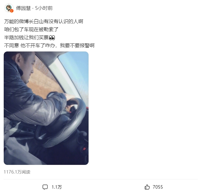 傅園慧早前發博求助稱:「咱們包了車現在被勒索了,半路加錢讓我們買票;我們不同意,他不開車了咋辦,我要不要報警啊!」她約2小時後更新微博,指吉林文旅部門已經第一時間介入事件,問題已經解決。吉林有關部門隨後表示,事發地已展開全面調查,表示將對司機的違規行為嚴厲懲處,絕不姑息。