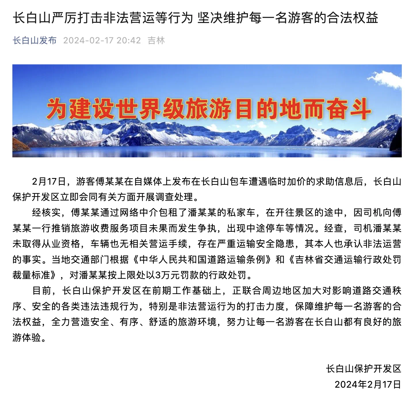 通告指,目前,長白山保護開發區在前期工作基礎上,正聯合周邊地區加大對影響道路交通秩序、安全的各類違法違規行為,特別是非法營運行為的打擊力度,保障維護每一名遊客的合法權益,全力營造安全、有序、舒適的旅遊環境,努力讓每一名遊客在長白山都有良好的旅遊體驗。