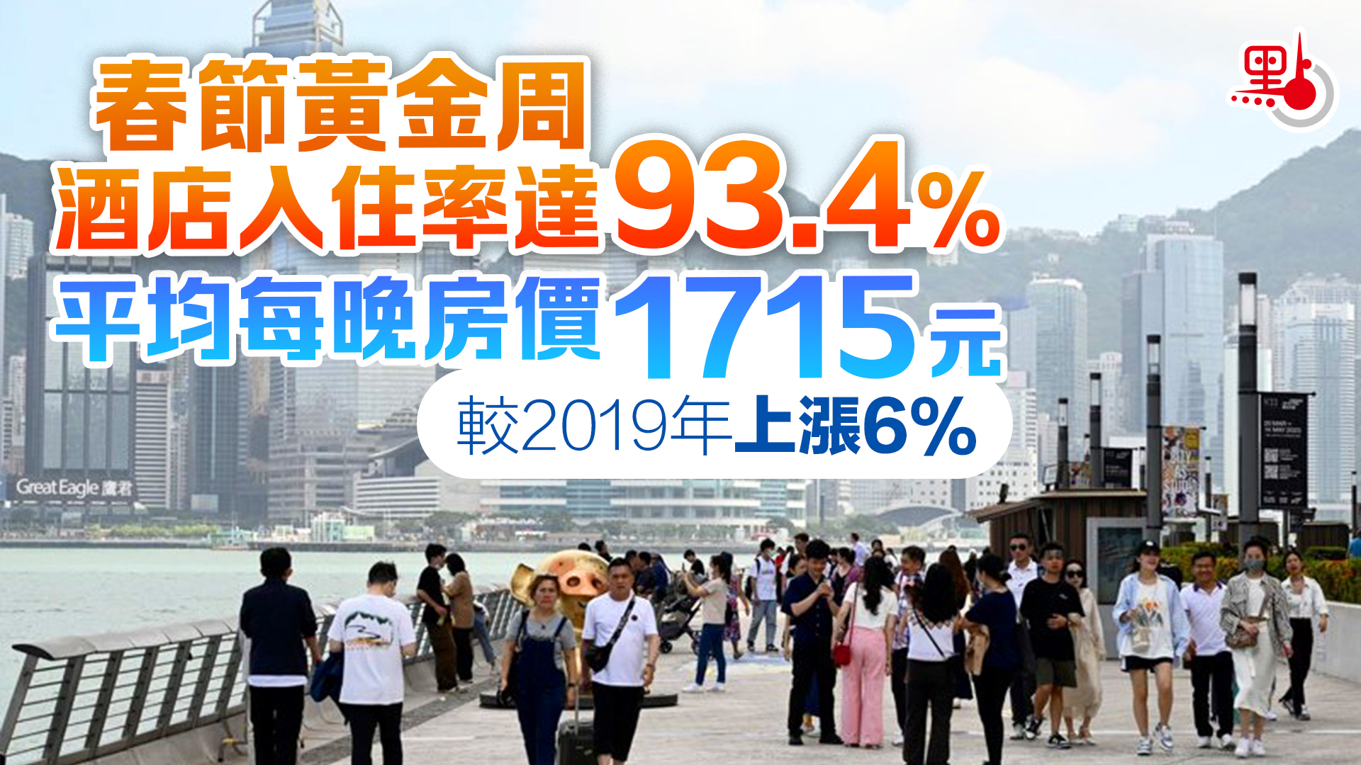 【點新聞報道】香港酒店業協會今日(26日)公布,本港酒店在剛剛過去的農曆新年黃金周期間,整體酒店客房平均入住率為93.4%,較2019年同期輕微下降0.4個百分點,整體表現比預期較好;酒店每日平均房價為1715港元,較2019年上漲6%。