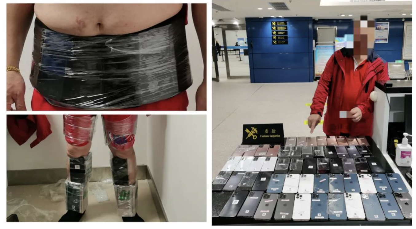 當天6時33分,一名身穿紅色外套的男子從青茂口岸旅檢現場「無申報通道」入境,現場關員察覺該旅客身形臃腫,遂對其進行攔截。來到查驗台後,該旅客在出示證件時試圖逃跑,被現場關員當即攔下。經進一步檢查,在該旅客外套口袋、腰腹部、大腿及小腿部發現黑色彈力繃帶和塑料膜捆綁的舊手機56台。