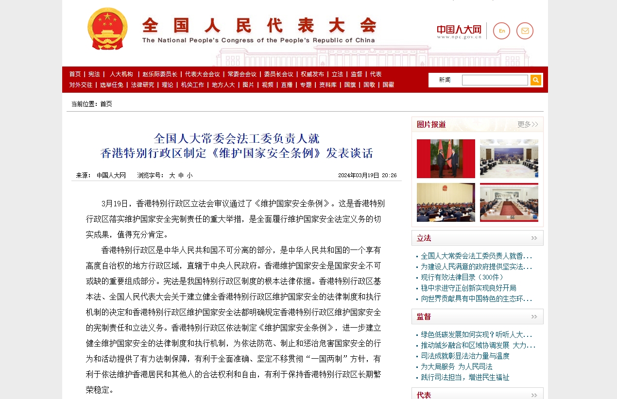 【點新聞報道】香港特區立法會今日(3月19日)全票通過《維護國家安全條例草案》,順利完成基本法第23條立法。今日,是香港的歷史時刻,是香港等待了26年8個月零19日的歷史時刻,是特區第六屆政府和第七屆立法會終於共同完成光榮使命的歷史時刻,是香港特區共同譜寫光榮歷史的驕傲時刻。全國人大常委會法工委負責人就香港特別行政區制定《維護國家安全條例》發表談話,以下為全文: