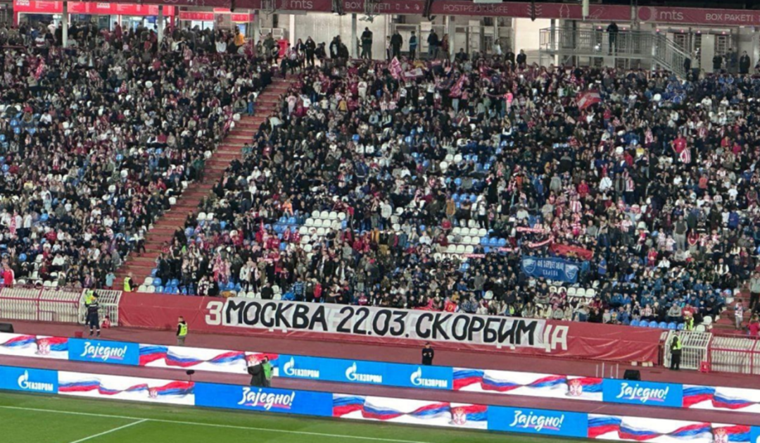 【點新聞報道】當地時間3月22日晚上8點左右,俄羅斯莫斯科近郊的克羅庫斯城音樂廳發生恐怖襲擊。截至目前,襲擊已造成至少143人死亡,逾百人受傷,不排除數字進一步上升。綜合多家俄媒報道,在此背景下,俄羅斯聖彼得堡澤尼特隊與塞爾維亞貝爾格萊德紅星隊當地時間23日在貝爾格萊德舉行友誼賽,現場球迷用多種方式向俄民眾表示支持。