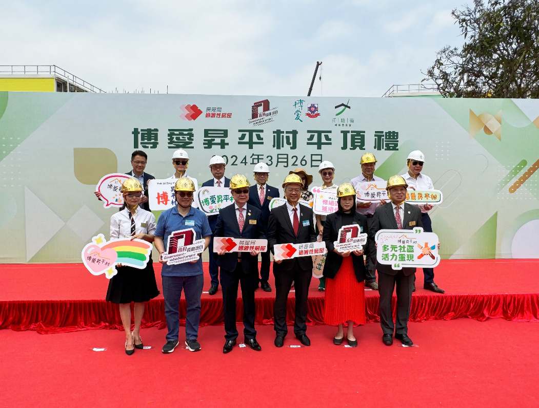 【點新聞報道】房屋局副局長戴尚誠,博愛醫院董事局主席陳首銘、候任主席周駿達,立法會議員、北區區議員、打鼓嶺區鄉事委員會主席陳月明等人今日(26日)上午一同出席在新界打鼓嶺坪輋路地段DD82 (昇平小學舊址)舉行的博愛昇平村過渡性房屋項目平頂禮。