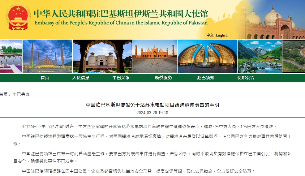 3月26日,巴基斯坦總統扎爾達里發表聲明,強烈譴責達蘇水電站項目恐襲事件,對中國公民遇難表示深切哀悼,向遇難中國公民家屬和中國政府表達慰問。表示反巴基斯坦分子破壞巴中友誼的圖謀是永遠不會得逞的。