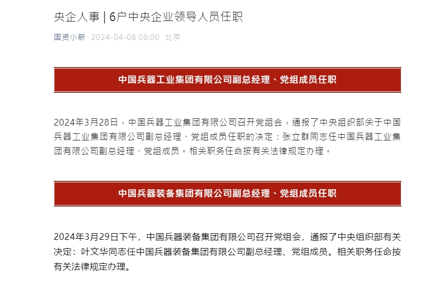 3月29日下午,中國兵器裝備集團有限公司召開黨組會,通報了中央組織部有關決定:葉文華同志任中國兵器裝備集團有限公司副總經理、黨組成員。相關職務任命按有關法律規定辦理。