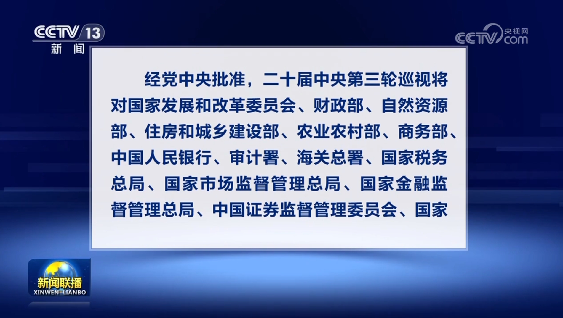 【點新聞報道】據央視新聞聯播今日(8日)消息,經黨中央批准,二十屆中央第三輪巡視將對國家發展和改革委員會、財政部、自然資源部、住房和城鄉建設部、農業農村部、商務部、中國人民銀行、審計署、海關總署、國家稅務總局、國家市場監督管理總局、國家金融監督管理總局、中國證券監督管理委員會、國家統計局、國家知識產權局、國家糧食和物資儲備局、國家能源局、國家林業和草原局、國家外匯管理局、中華全國供銷合作總社、全國社會保障基金理事會、中國地質調查局、上海證券交易所、深圳證券交易所、中國進出口銀行、中國工商銀行股份有限公司、中國農業銀行股份有限公司、中國銀行股份有限公司、中國建設銀行股份有限公司、交通銀行股份有限公司、中國中信集團有限公司、中國人壽保險(集團)公司、中國太平保險集團有限責任公司、中國出口信用保險公司等34家單位黨委(黨組)開展常規巡視。