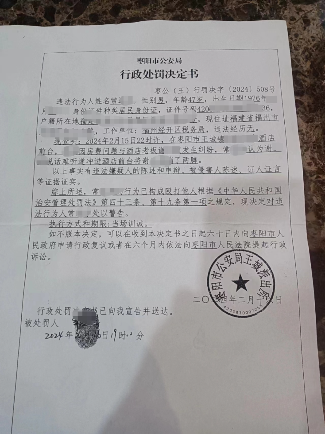 酒店老闆謝先生稱,2月15日晚上正值春節期間,直接打人者為福建省福州市經濟開發區稅務局幹部常某,同行的系湖北省襄陽市審計局幹部陳某、王城鎮幹部李某。監控顯示,常某毆打謝先生後被陳某拉出酒店,在警車到達前後多次說到「在福州沒人敢跟我這樣,你什麼級別給我玩這個,棗陽副市長才跟我們平級」。2月16日,常某被派出所訓誡後離開。此前有媒體報道稱,李某對常某表示要讓消防來查酒店。